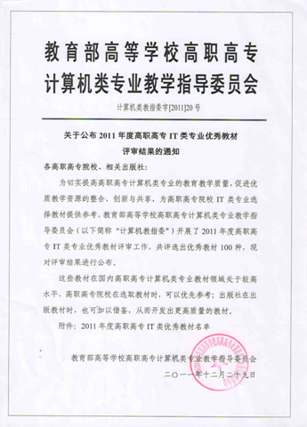 优秀教材的评选是教育部高等学校高职高专计算机类专业教学指导委员会为切实提高高职高专计算机类专业的教育教学质量,促进优质教学资源的整合、创新与共享,为高职高专院校 IT 类专业选择教材提供参考而开展的,此次共评选出优秀教材 100 种。这些教材在国内高职高专计算机类专业教材领域处于较高水平,高职高专院校在选取教材时,可以优先参考;出版社在出版教材时,也可加以借鉴,从而开发出更高质量的教材。