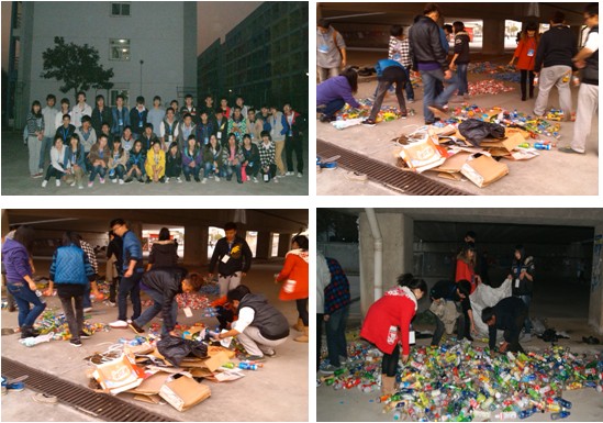 下午4时30分,按照活动安排所有人员在食堂集合,各部长们分配任务,随即大家就开始行动起来,本来以为活动会很难进行的,可是没想到同学们都很配合,收获很大,慢慢的同学们的热情高涨,越干越起劲,15栋宿舍楼顿时活跃起来。一个小时后大家意犹未尽的带着各自最后的“战果”集合在了“瓶子山”周围,每个人脸上都洋溢着满意的笑容。随后,主席就开始动员大家把瓶子分类、装袋,男同学捡,女同学拿着袋子,又是一番埋头苦干。半个小时后,在大家的共同努力下,把所有的瓶子都进行了分类处理。