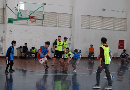 比赛分上下半场共四节,来自英国巴斯城市学院以及我系的学生被混编为蓝、绿两队。上半场,绿队迅速掌控比赛节奏,一度将比分拉开,上半场比赛结束,绿队以出色的团队配合领先蓝队十余分。下半场比赛,双方都进行了人员调整。下半场比赛一开场,蓝队一记快攻抢先得分,并且将得分不断追赶,绿队也不甘示弱,迅速调整状态,稳住节奏,比分交替上升。比赛中,中英学生用简单的英语进行交流,实现精妙配合和得分,赛场上不时听到同学们“jump shot”、“ three-point shot”、“rebound”、“come on”、“very good”等声音。中英学生篮球比赛打的别具特色,也吸引了很多其他正在参与运动的其他同学前来观看。