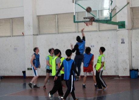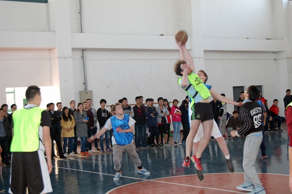 比赛分上下半场共四节,来自英国巴斯城市学院以及我系的学生被混编为蓝、绿两队。上半场,绿队迅速掌控比赛节奏,一度将比分拉开,上半场比赛结束,绿队以出色的团队配合领先蓝队十余分。下半场比赛,双方都进行了人员调整。下半场比赛一开场,蓝队一记快攻抢先得分,并且将得分不断追赶,绿队也不甘示弱,迅速调整状态,稳住节奏,比分交替上升。比赛中,中英学生用简单的英语进行交流,实现精妙配合和得分,赛场上不时听到同学们“jump shot”、“ three-point shot”、“rebound”、“come on”、“very good”等声音。中英学生篮球比赛打的别具特色,也吸引了很多其他正在参与运动的其他同学前来观看。