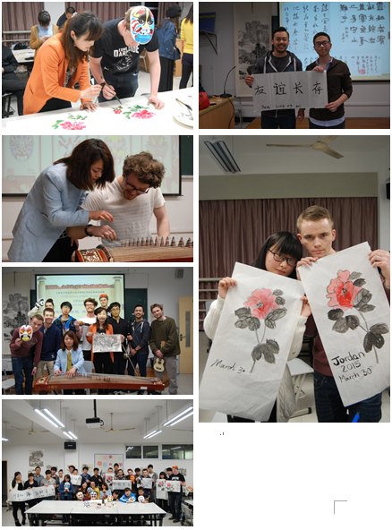 活动中,英国留学生Ben、Robert、Chris等上台展示了英国的文化特色,图文并茂的讲解了英国历史、饮食、运动、传统节日、皇室家族等,让在座的中国青年学生对英国有了深入的认识,特别是谈到英国足球,两国青年学生更是兴趣盎然。随后,计算机应用系学生会学习部长邓鹏宇同学介绍了我国传统文化——书法、国画、京剧和传统民族乐器,院团委民乐社的同学现场演绎了古筝、笛子、二胡、葫芦丝等中国古典乐器的精彩选段,丝竹悦耳,令在场听众陶醉其中。之后,我系宋知平老师以及书法社的同学手把手的教留学生学习了我国传统艺术:国画及书法。中英两国学生们一边写字作画,一边交流两国传统文化。