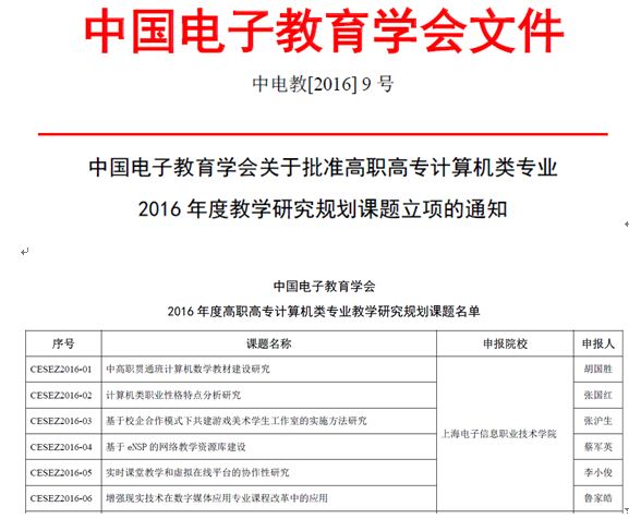 根据 中国电子教育学会高职高专计算机类专业2016年度教学研究规划课题立项的通知精神,我系根据实际教学情况, 积极推动教学研究工作, 组织开展教师积极申报课题,力争能在高职高专计算机类专业教学改革方面有所突破。