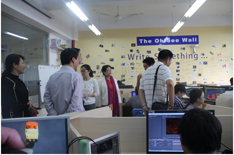 首先,谌书记、周主任代表系部对来访同仁表示了热烈欢迎,紧接着就我系专业设置、师资队伍、学生工作室、实训室建设、技能大赛等进行了介绍说明,并带领来访者着重参观了学生景格多媒体工作室、半城工作室、信息安全工作室、特长生工作室、网络工作室,双方就学生工作室的运行、管理等展开了深入交流。