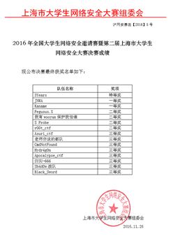 2016年11月26日,计算机应用系信息安全与管理专业学生组建3Years战队在指导教师张月红带领下代表我院参加了2016年全国大学生网络安全邀请赛暨第二届上海市大学生网络安全大赛决赛,决赛在东华大学图文信息中心拉开帷幕。3Years战队在队长薛兴儒同学的指挥下通力合作,最终在东华大学、南京航空航天大学、解放军理工大学、北京航空航天大学、中山大学、同济大学、湖南科技大学等众多重点高校中脱颖而出、以高于第二名七百多分的绝对优势荣获特等奖。
