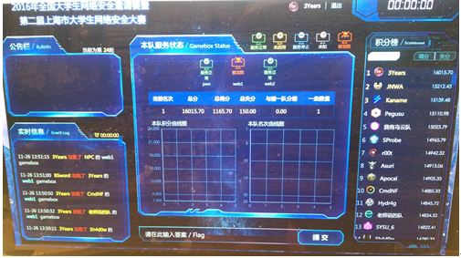 此次CTF的线下比赛采取攻防对抗赛形式进行。每个参赛队互为攻击方和防守方,参赛队要在防守自己服务器的同时,还要攻击其它参赛队的服务器,服务器上存在若干漏洞,攻击成功后可得分,参赛选手需尽快修复漏洞,每个队伍初始15000分,提交Flag成功后,表示攻击成功,攻击方得5分、被攻击方表示防守失败,被扣10分。我校最终以总分16015分斩获特等奖。赛前战队成员集训多日,研究和讨论攻守方法。比赛时分工合作,攻守得当,发挥了较高的水平。