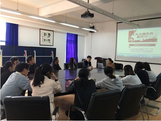 11月13日下午,我院教工第二党支部组织党员教师学习十九大精神。会上,教工第二党支部书记蔡军英同志通过对十九大报告关键词的导读,带领大家对十九大提出的新思想、新论断、新提法、新举措作了一次清晰的梳理,并借助“共产党网”提供的“干货”带领大家速读了十九大报告,对习近平新时代中国特色社会主义思想的“八个明确”和十四条基本方略有了更深的理解和领悟。最后,她动员与会党员会后完成“学习贯彻十九大精神知识自测”。