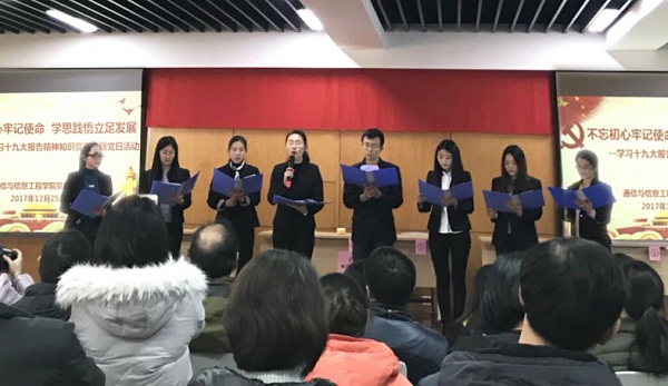 12月25日下午,我院党总支组织开展了“不忘初心牢记使命学思践悟立足发展——学习贯彻党的十九大精神知识竞赛”主题党日活动。校党委组织部相关老师、各二级单位党总支书记、党支部书记、组织员、我院全体党员及教工代表百余人共同参加了活动。活动在I-401多功能阶梯教室举行。
