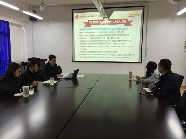 3月12日上午,我院党总支在J313召开班子集中学习会,党总支书记谌明举同志主持,班子全体成员参加。会议进一步深入学习了党的十九大精神和党章,深刻领会习近平新时代中国特色社会主义思想的历史地位和丰富内涵,搞清楚、弄明白“八个明确”主要内容和“十四个坚持”基本方略的重大创新思想创新观点,为开好我院2017年度党员领导干部民主生活会打牢了思想基础。(供稿:胡月玲)