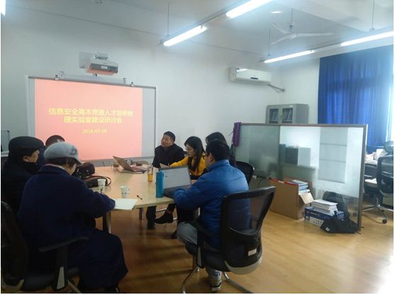 2018年3月8日,我院在J307召开信息安全高本贯通人才培养物理实验室建设研讨会。参见本次会议的有应用技术大学黄耀清教授、郝成红副教授;企业专家赵东汴;我院院长胡国胜教授、副院长包晓蕾老师、以及马小丹、彭雪海老师。