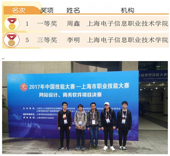 近日,2017年中国技能大赛—上海市职业技能大赛网站设计项目决赛获奖名单公布,我院学生周鑫荣获一等奖、李明荣获三等奖。