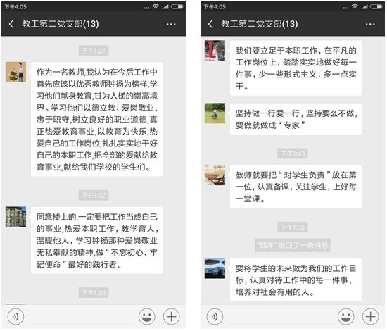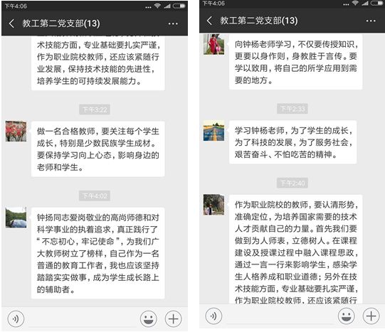 在网络交流活动中,大家一起学习了7名优秀共产党员的事迹。这7名同志集中展现出了新时代信念无比坚定、对党绝对忠诚、勇于担当作为、积极干事创业的党员先锋模范代表所特有的高贵品质,是每一位共产党员“不忘初心、牢记使命”学习的先进典范。特别是钟扬老师的先进事迹,让同为教师的党员同志们感触颇深,大家在微信群中交流感想,纷纷表示要以先进典型为榜样,努力在教师岗位中营造学先进、赶先进、当先进的良好氛围,为学院发展贡献更大的力量。