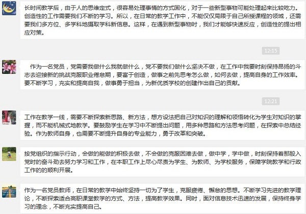 本次主题党日,支部党员们学习了8月20日李强书记在全市组织工作会议上的讲话精神,认真领会李强书记提出的“充满激情、富于创造、勇于担当”的好干部特质。这些特质是与上海所处的发展阶段、所追求的发展目标相适应的干部个性特质。充满激情,就是干事创业必须精神抖擞、斗志旺盛,充满那么一股子气和劲。富于创造,就是不能固步自封、因循守旧,要敢闯敢试、敢为人先。勇于担当,就是愿意做事、敢于扛事、能够成事。在学习中,党员教师们表示这些特质也是对我们一线教师的特质要求,并发表了学习心得: