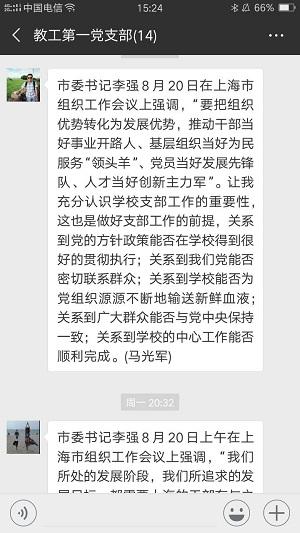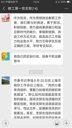 为贯彻落实李强书记在全市组织工作会议上讲话精神,争做“充满激情、富于创造、勇于担当”的党员和党员干部,我院教工第一支部开展“争做充满激情、富于创造、勇于担当好干部”主题党日活动。党员同志们围绕李强书记的讲话,在支部微信群展开了热烈的交流讨论。