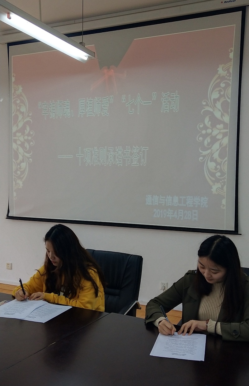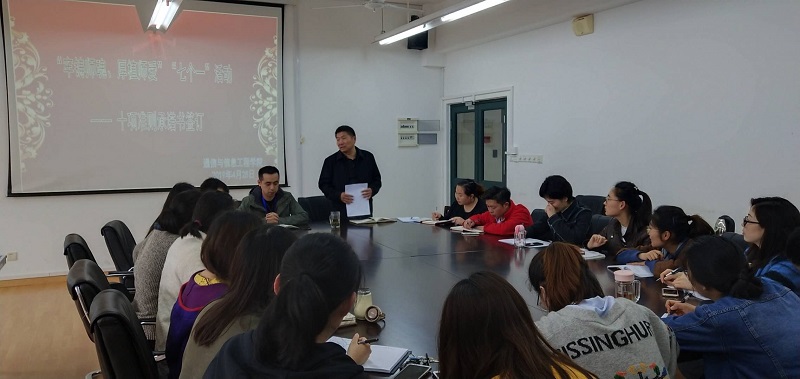 2019年4月28日下午,我院学生党支部在J313会议室开展“牢铸师魂、厚植师爱”主题教育“七个一”之“一项承诺”活动,全体辅导员现场签订了《上海电子信息职业技术学院教师职业行为十项准则承诺书》。