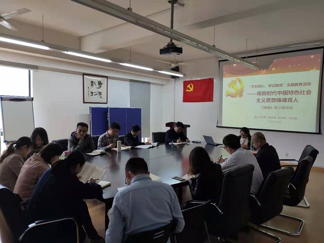 教师第二党支部组织党员在J313会议室集中学习《习近平关于“不忘初心、牢记使命”论述摘编》,党员们各自领读了第三章中自己最有感想的段落,并紧紧围绕“用新时代中国特色社会主义思想铸魂育人”主题,结合本职工作交流了学习体会。