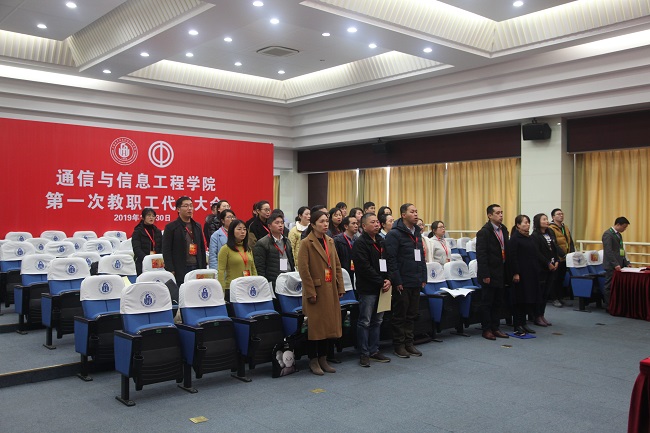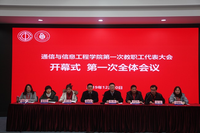 大会在雄壮的国歌声中开始。张涛副书记为本次教代会致开幕辞,受学校党委田钦书记委托,张涛副校长代表学校党委向大会的胜利召开表示热烈的祝贺,代表校工会向出席会议的各位代表致以亲切的问候。他说,通信学院第一次教代会的隆重召开,是上海电子信息职业技术学院政治生活中的一件大事,更是通信学院政治生活中的一件大事,对通信学院调动广大教职工的积极性、主动性和创造性,开创学院各项工作新局面,推动学院新发展起到十分重要的作用。他对通信学院推进民主管理、先试先行、积极筹备第一次教职工代表大会工作给予充分肯定,并预祝大会顺利召开。开幕式后,我院党总支副书记、院长胡国胜作了《通信学院2019年度行政工作报告》,党总支书记陈林河介绍了《通信学院年终绩效分配方案(草案)》。