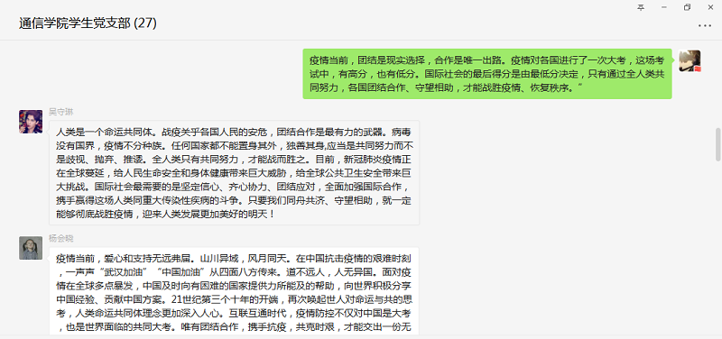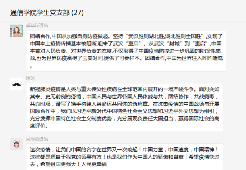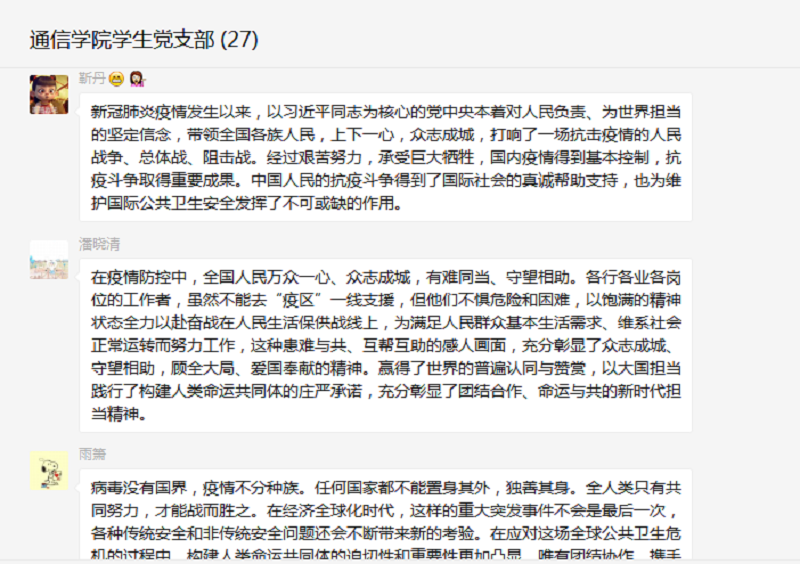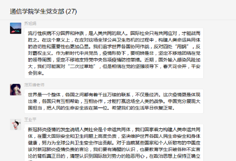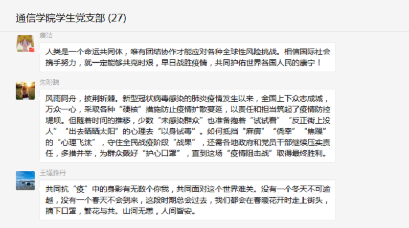 作为新时代的中共党员,在疫情形势下,我们会明辨是非,坚定不移地支持党中央各项疫情防控举措,引导和教育我们的学生,摒弃狭隘的民族主义,树立人类命运共同体理念。坚信在党的坚强领导下,春天花会开,平安会到来。(供稿:通信与信息工程学院学生党支部)