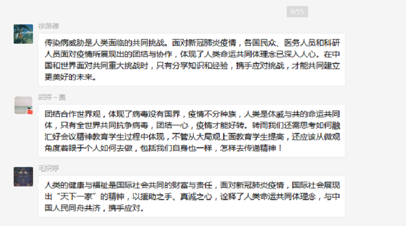 病毒没有国界,疫情不分种族,中国秉持人类命运共同体理念,积极开展抗疫国际合作,携手应对共同威胁和挑战,同舟共济、守望相助。通过深入学习交流,党员同志们一致认为,习近平总书记的重要讲话和一系列重要指示深刻阐述了疫情防控的重大意义、基本策略和重点举措,纷纷表达疫情当前,团结是现实选择,合作是唯一出路。新冠病毒引发的肺炎疫情对世界各国进行了一次大考,这场考试中,有高分,有低分。在这场战疫中,人类社会的最后得分由最低分决定,只有通过全人类共同努力,各国团结合作、守望相助,才能最终战胜疫情、恢复秩序。中国以大国担当践行了构建人类命运共同体的庄严承诺,彰显了团结合作、命运与共的新时代担当精神。