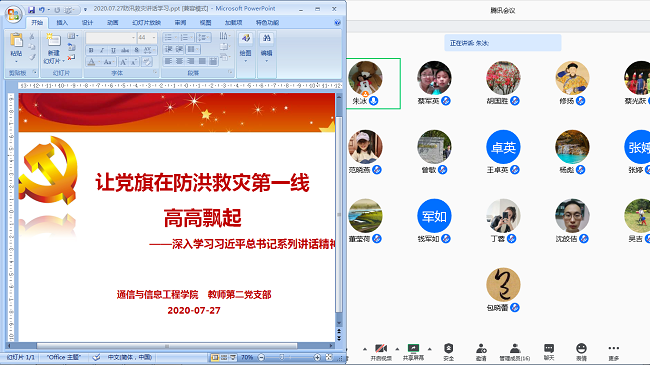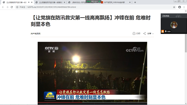 7月27日,我院教师第二党支部全体党员同志认真学习了习近平总书记对进一步做好防汛救灾工作作出重要指示的系列报道及中共中央组织部印发《关于在防汛救灾中充分发挥基层党组织战斗堡垒作用和广大党员先锋模范作用的通知》。通过“读《通知》原文”、“看典型事迹”,聚焦习近平总书记系列讲话和“让党旗在防汛救灾第一线高高飘扬”系列视频案例学习,对习近平始终落实贯彻的亲民、爱民思想,以人民为本,切实履行党组织领导人的初心和担当,感同身受。