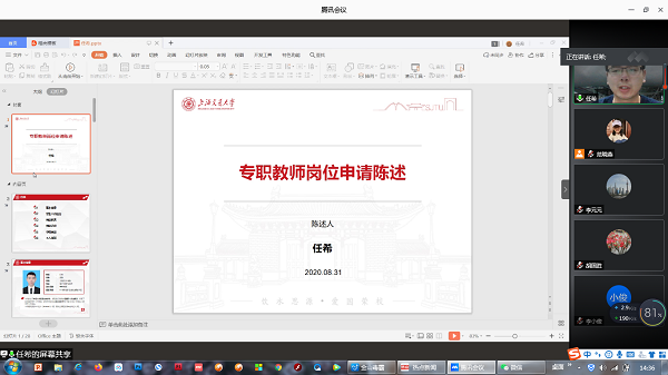 2020年8月31日,我院通过腾讯会议,再次组织开展了暑期云端教师面试工作。本次面试由我院院长胡国胜、副院长李元元、相关教研室主任杨彪、李小俊、朱冰、李昉、俞玉莲等7位老师对参加应聘的4名老师进行考核,学院办公室主任范晓燕主持。
