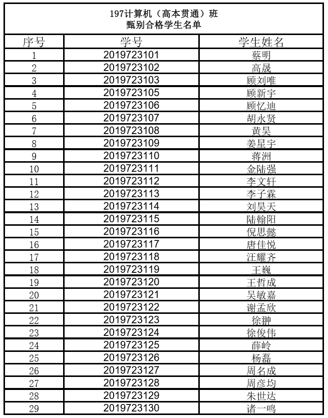 附表: 197计算机1班(高本贯通)甄别合格学生名单