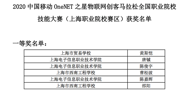 我院学生在上海市“四大品牌”建设赛项——2020 中国移动 OneNET 之星物联网创客马拉松全国职业院校技能大赛(上海职业院校赛区)中取得佳绩