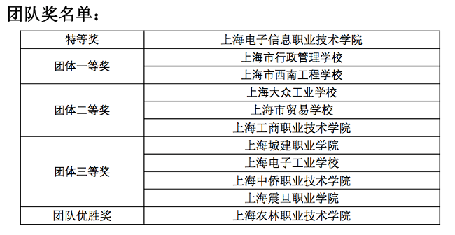 经过一天的角逐,共产生个人一等奖6名、二等奖12名、三等奖18名,以及团体特等奖、一、二、三等奖。上海电子信息职业技术学院获得团体特等奖、3项个人一等奖、2项个人二等奖、4项个人三等奖。
