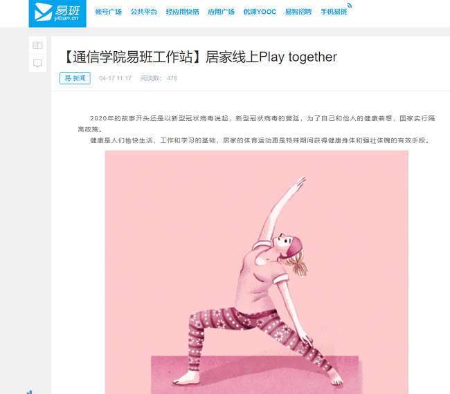 为进一步推进校园精神文明建设,提高同学们对新冠疫情的正确认识,缓解隔离焦虑,安心居家防疫。4月17日,上海电子信息职业技术学院通信与信息工程学院学生易班工作站在大学生网络思政基地——易班网发起云陪伴系列活动之“居家线上Play together”的云健身主题活动。