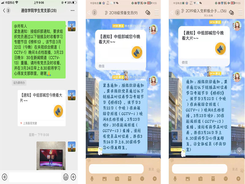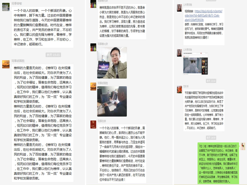 为深入推进党史学习教育,充分发挥党员先进典型示范引领作用,我院党总支积极响应学校党委工作部署,以党支部为单位通过微信群组织全体党员、入党积极分子于3月22、23日晚收看专题节目《榜样5》。