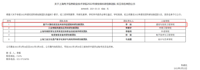 近日,我校公布2022年度校级科研创新团队名单,我院以李昉老师为负责人的“基于计算机视觉技术的特征提取科研创新团队”榜上有名。