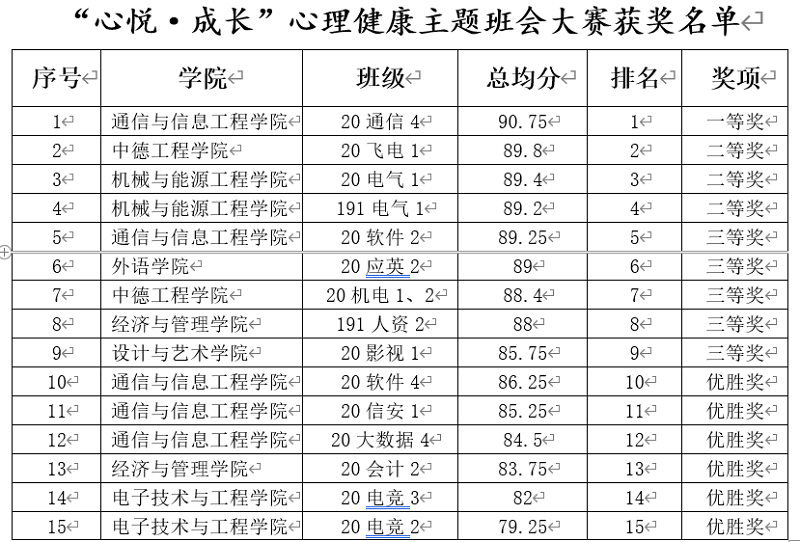根据《2021年上海电子信息职业技术学院5.25“百年·润心”心理健康教育活动——“心悦·成长”心理健康主题班会大赛活动通知》要求,经过各二级学院初赛、邀请评委材料评分,决出最终名次奖项,现予以公示。