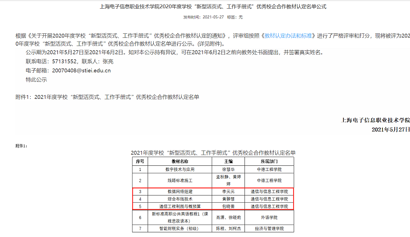 近日,学校教务处公布了2020年度学校“新型活页式、工作手册式”优秀校企合作教材认定名单,我院李元元主编的《数据网络组建》、黄翀慧主编的《综合布线技术》、包晓蕾主编的《通信工程与概预算》三本教材榜上有名。