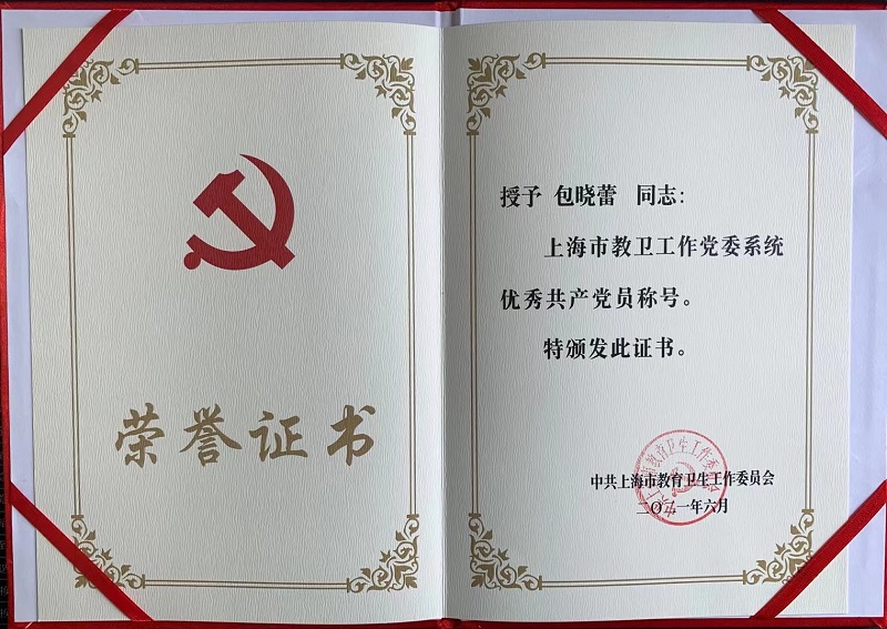 今年是中国共产党成立100周年,经学院推荐、学校报送、市教卫工作党委审核审议、遴选公示,我院通信技术系包晓蕾同志荣获“上海市教卫工作党委系统优秀共产党员”称号。