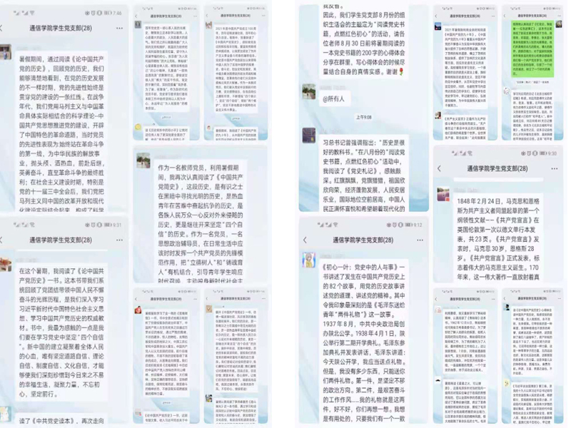 分享会上,徐珊珊老师带领党员重温了习近平总书记在庆祝中国共产党成立100周年大会上的重要讲话精神,并指出持续加强党史学习教育对做好辅导员本职工作及学生思想政治教育工作的重要意义。党员同志结合暑期学习分享了心得:读《党史札记》,吕程老师说“一百年的光辉历程,走出了一条亘古不变的真理,中国共产党是时代中的中流砥柱,是中华民族的脊梁”;读《初心一叶:党史中的人和事》,刘园园老师认为,用党的历史故事讲述党的道理、党的精神,并告诫自己,在学生思想政治教育工作中要保持坚定的政治方向,帮助学生树立远大的理想和正确的价值观;读《论中国共产党的历史》,王逃西老师表示今后要加强党史学习,多去了解历史,结合岗位实际,有针对性地组织党员学习党史,做好发展党员工作,为学院的党建工作质量提升做出自己应有的贡献。