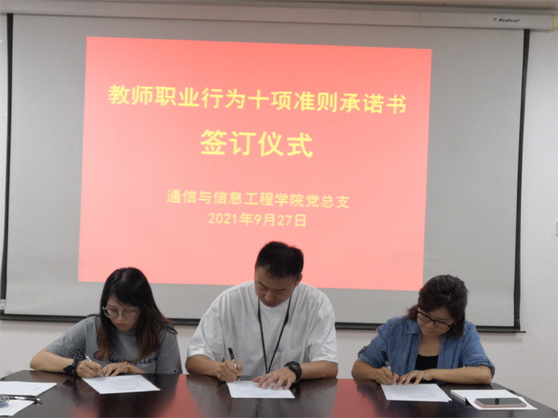 根据学校教师工作部统一要求,学院党总支于2021年9月27日下午,在J313会议室组织新教师开展了教师职业行为十项准则承诺书签订仪式。2020年9月-2021年9月,新入职的15名教师参加了签订仪式,仪式由王逃西老师主持,学院党总支书记陈林河出席仪式。