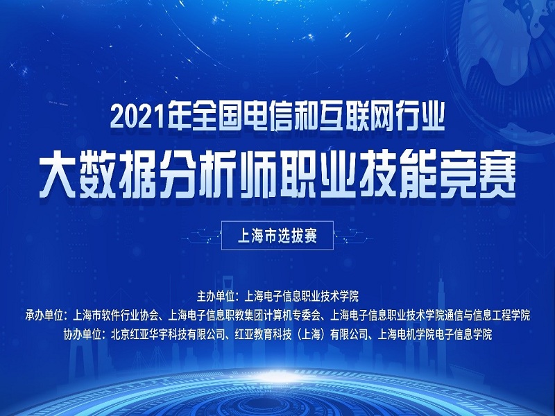 11月20日,2021年全国电信和互联网行业大数据分析师技能竞赛(上海市选拔赛)在我校成功举办。本次竞赛由上海电子信息职业技术学院主办,上海市软件行业协会、上海电子信息职教集团计算机专委会、上海电子信息职业技术学院通信与信息工程学院承办,北京红亚华宇科技有限公司、红亚教育科技(上海)有限公司、上海电机学院电子信息学院提供技术支持。