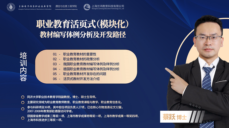 本期培训于2022年4月21日举办,特别邀请了同济大学职业技术教育学院蔡跃博士做客腾讯会议直播间,开展了 “职业教育活页式(模块化)教材编写体例分析及开发路径”的专题分享。