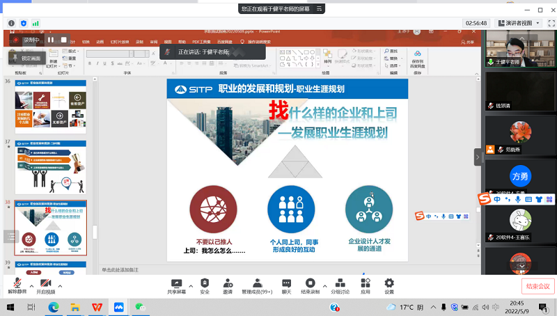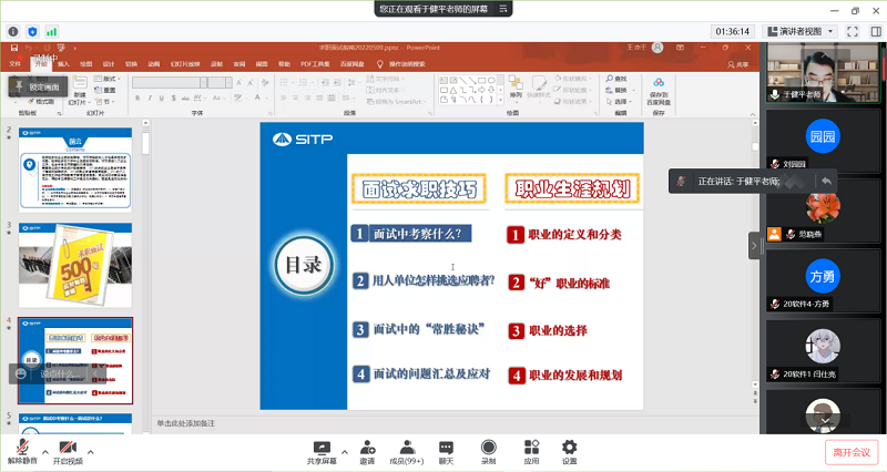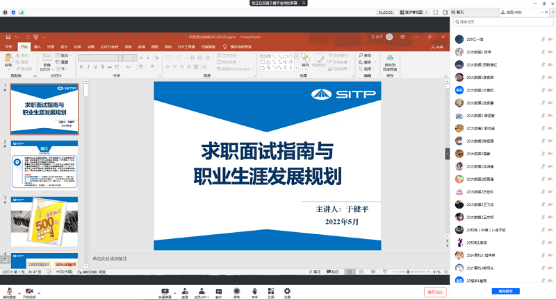 为了引导青年学生树立积极的就业观,熟知求职程序,帮助毕业生增强求职本领,助力学生职业生涯启航,我院特邀中国科学院上海技术物理研究所人事处于健平老师,于2022年5月9日作了题为《求职面试指南与职业生涯发展规划》的线上讲座。我院2023届及2022届部分学生积极入会学习,学生们反响热烈。