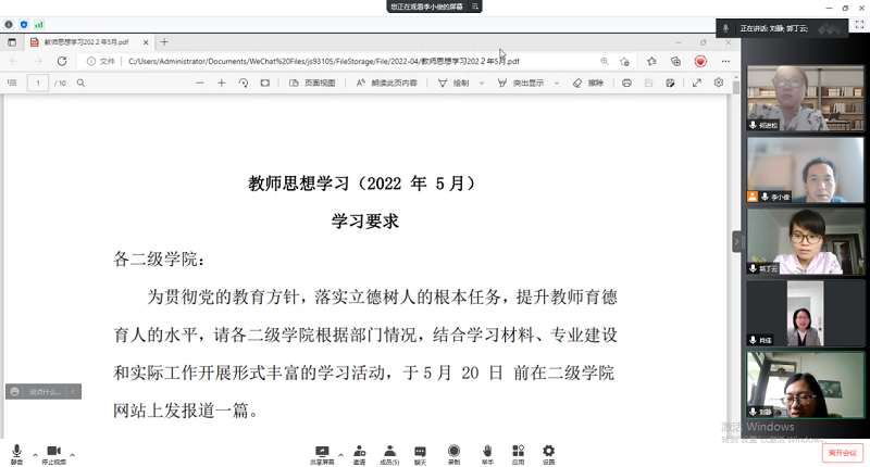 根据学校教师工作部下发的《教师思想学习2022年5月》学习要求,5月1日至13日,我院各教研室线上组织专任教师开展5月份教师思想学习。