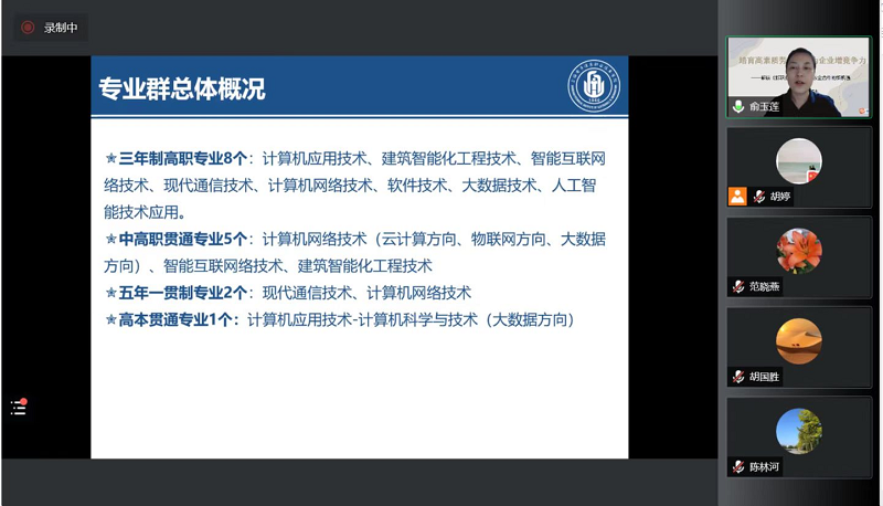 俞玉莲副院长就专业人才培养进行分享交流,通信学院目前拥有三年制高职专业8个、中高职贯通专业5个、五年一贯制专业2个、高本贯通专业1个。俞老师详细介绍了各个专业的重要课程、就业方向和获奖情况等方面内容,加深了企业对学院各专业的人才培养认知。