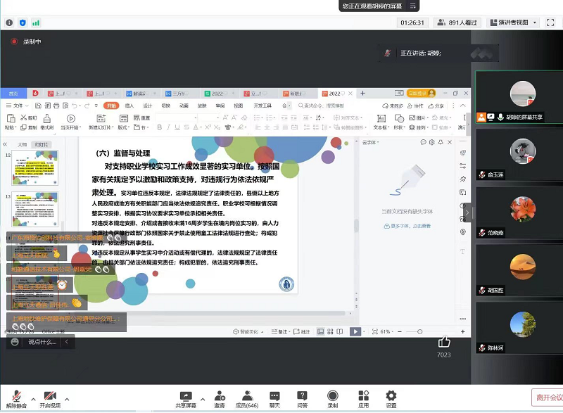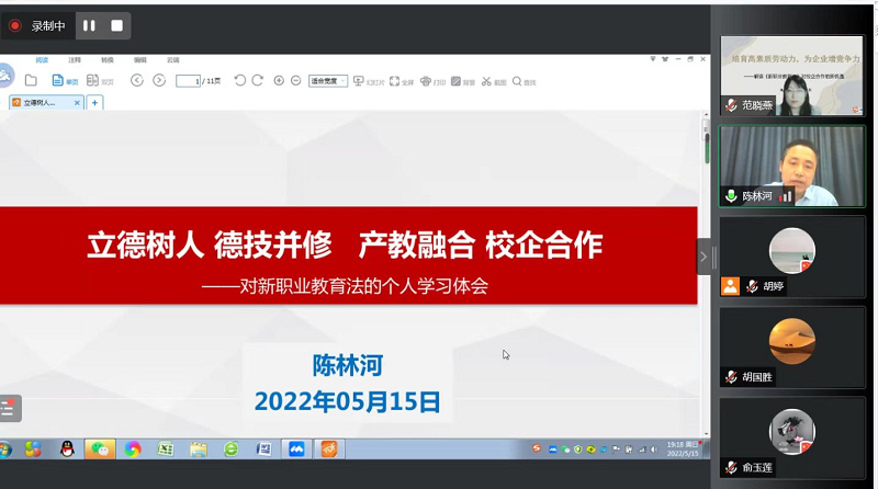 2022年5月15日,由我院主办的解读新修订的《职业教育法》相关培训圆满举行。我院院长胡国胜、党总支书记陈林河、党总支副书记范晓燕、副院长俞玉莲、就业指导老师胡婷出席本次会议。近1000人参加本次培训。此次培训就通信学院发展概况、《职业教育法》的新特点和校企合作新机遇以及对职业教育产生的影响、专业设置和分析、职业学校学生实习管理规定等进行解读。本次培训由通信与信息工程学院党总支副书记范晓燕主持。