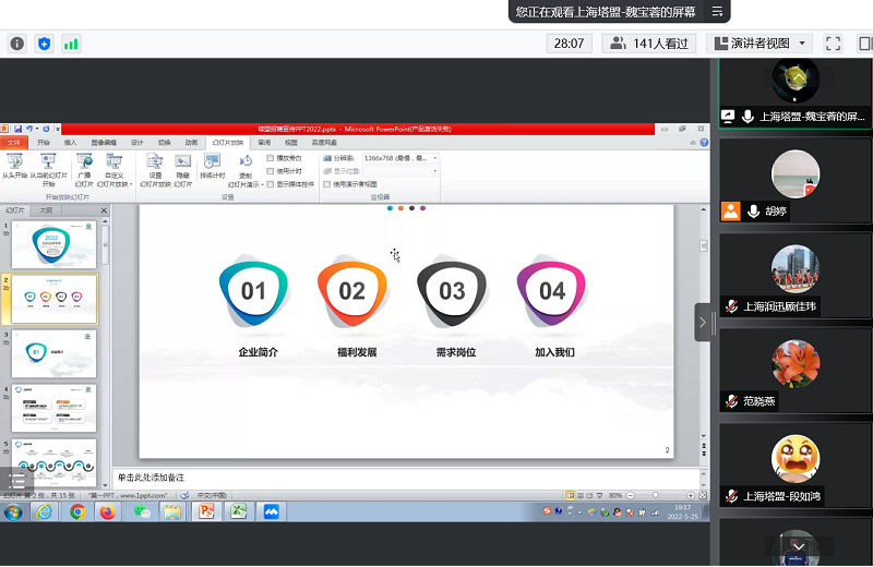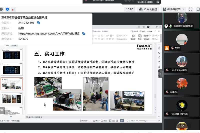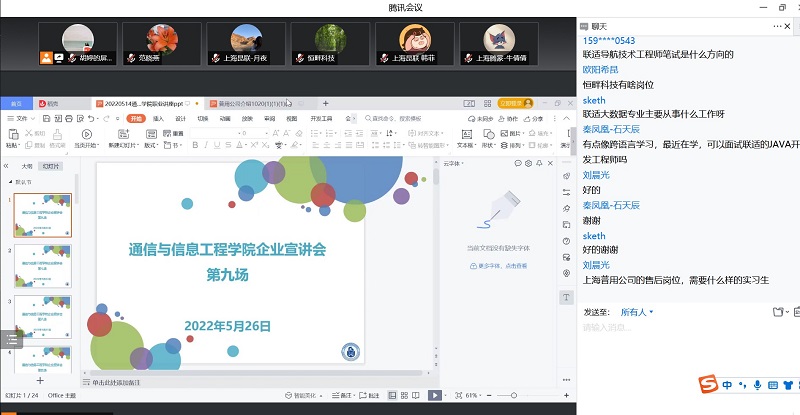 5月18-26日每天晚上7点,我院通过腾讯会议连续举办了9场企业宣讲会。我院党总支书记陈林河、党总支副书记范晓燕出席企业宣讲会。上海万科物业服务有限公司等37家企业嘉宾进行企业宣讲,我院2023届及部分2022届学生,有2000人次踊跃入会聆听。宣讲会由我院就业指导老师胡婷主持。