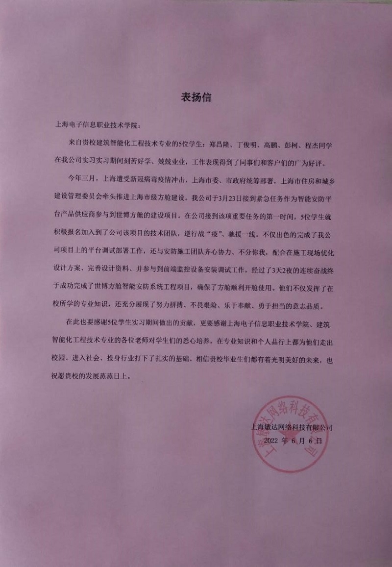 19楼宇2班的郑昌隆、丁俊明、高鹏、彭柯、程杰等同学,获得了来自实习单位——上海敏达网络科技有限公司的表扬信。在信中,企业对他们在实习期间的表现予以肯定和高度赞赏。尤其是疫情期间,这几位同学在参与上海市级方舱建时,他们运用专业知识与技能出色地完成了紧急任务,展现出来的拼搏与奉献的精神、担当与挑战的品质,深受企业好评。