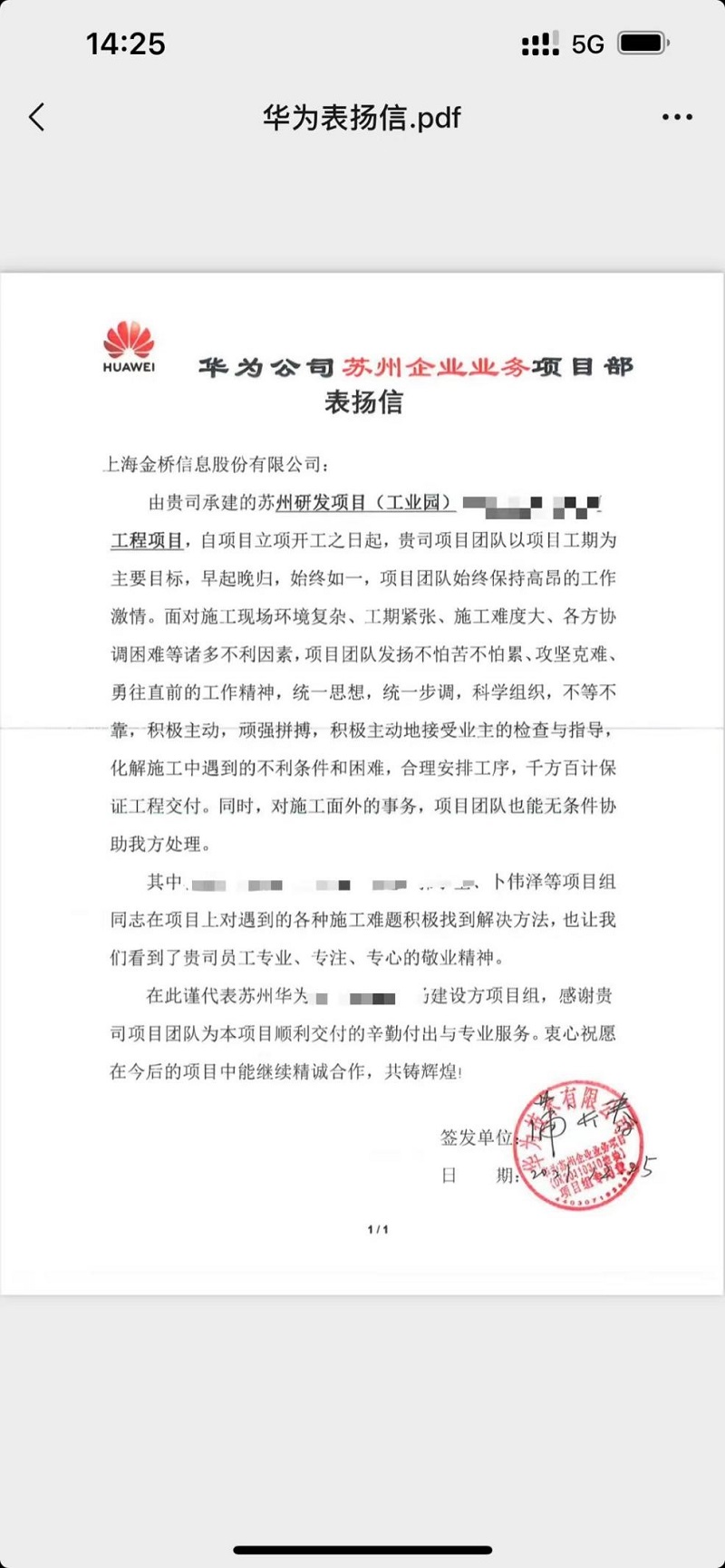19楼宇1班的卜伟泽同学获得了来自合作单位甲方的表扬信。该同学在上海金桥信息股份有限公司实习期间,作为一名新手,出差到外地,在工作过程中发挥了积极主动、顽强拼搏、不怕苦不怕累的精神。项目完成后,他们整个项目组收到了来自甲方——华为公司苏州企业业务项目部发来的表扬信。