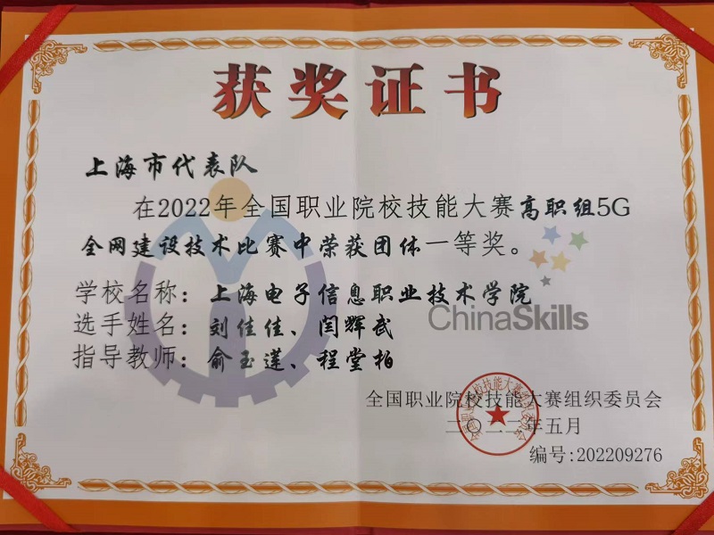 8月22日至23日,2022年全国职业院校技能大赛高职组“5G全网建设技术”赛项在山东省济南职业学院成功举办。来自全国各省市自治区的56支参赛队伍同台竞技。经过两天10小时的激烈角逐,20级通信3班刘佳佳、闫辉武两位同学,在比赛中脱颖而出,斩获全国一等奖,我院教师俞玉莲、程堂柏荣获全国职业院校技能大赛优秀指导教师奖。