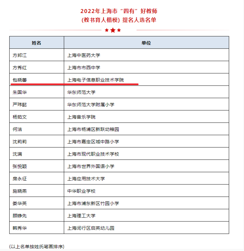 9月8日,中共上海市教育卫生工作委员会、上海市教育委员会正式公布2022年上海市“四有”好教师(教书育人楷模)名单及提名名单。我院教师包晓蕾榜上有名,荣获上海市“四有”好教师(教书育人楷模)提名奖。