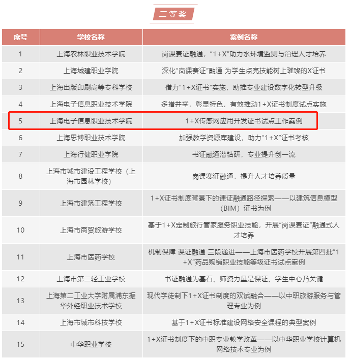 日前,上海市职业院校1+X证书制度试点专家委员会公布了2022年上海市职业院校1+X证书制度试点优秀案例,我院《1+X传感网应用开发证书试点工作案例》荣获二等奖。