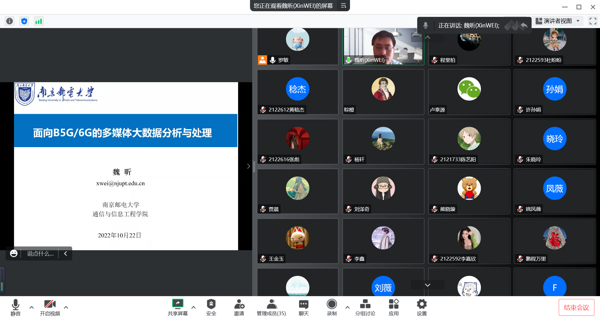 近日,我院邀请南京邮电大学通信与网络技术国家工程研究中心团队负责人魏昕教授,为学院相关专业师生作了《面向B5G/6G的多媒体大数据分析与处理》的线上讲座。