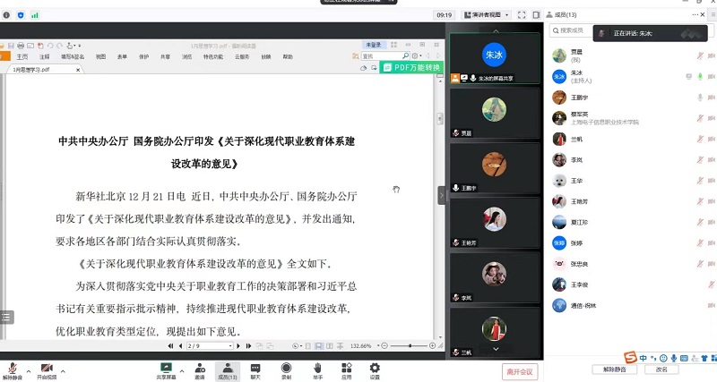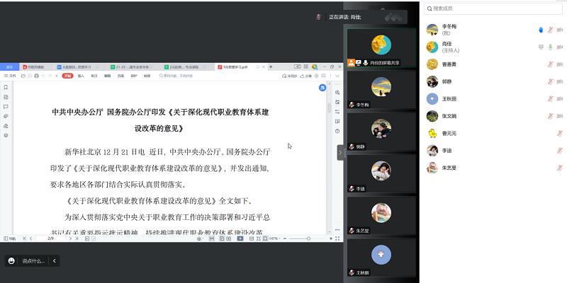 根据学校教师工作部下发的《教师思想学习(2023年1月)》学习要求,1月1日至19日,我院各教研室组织全体专任教师学习了《关于深化现代职业教育体系建设改革的意见》。