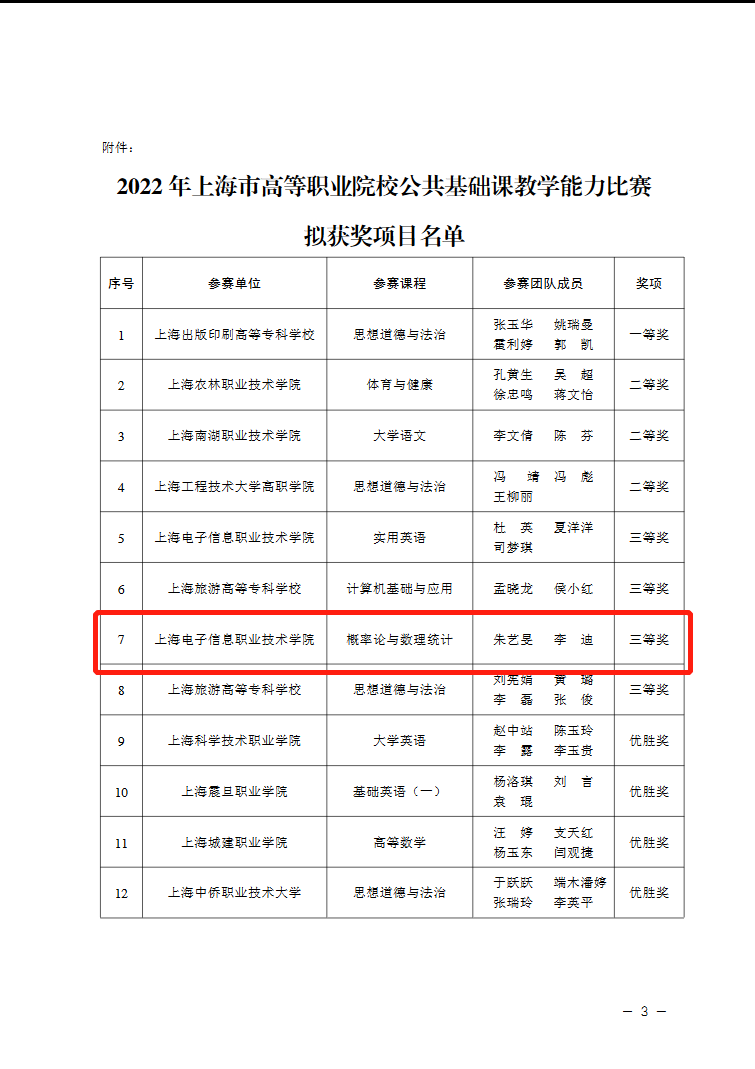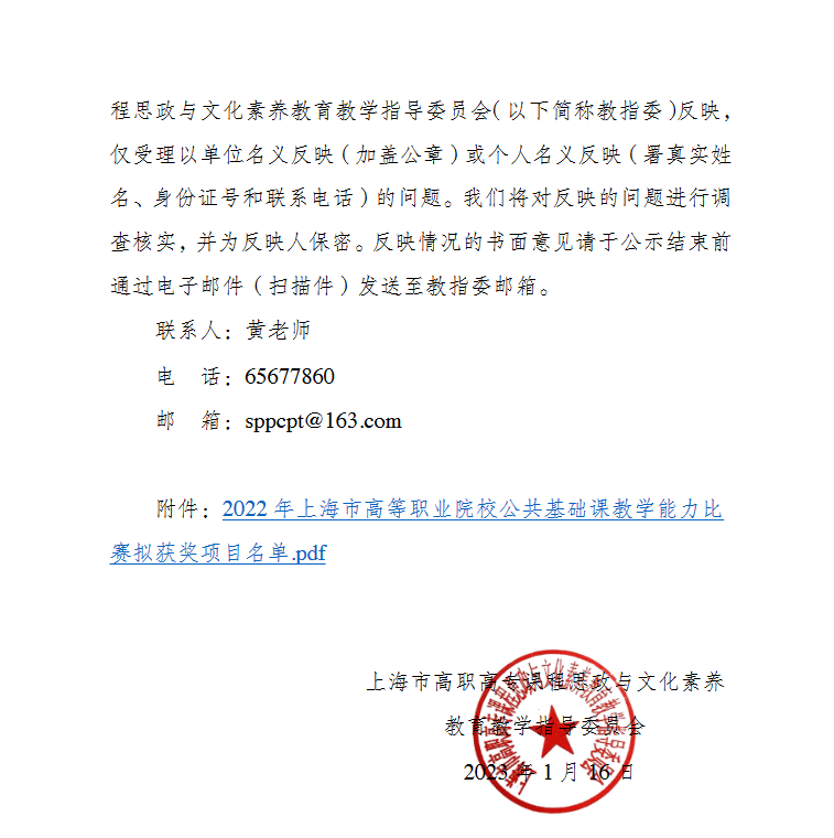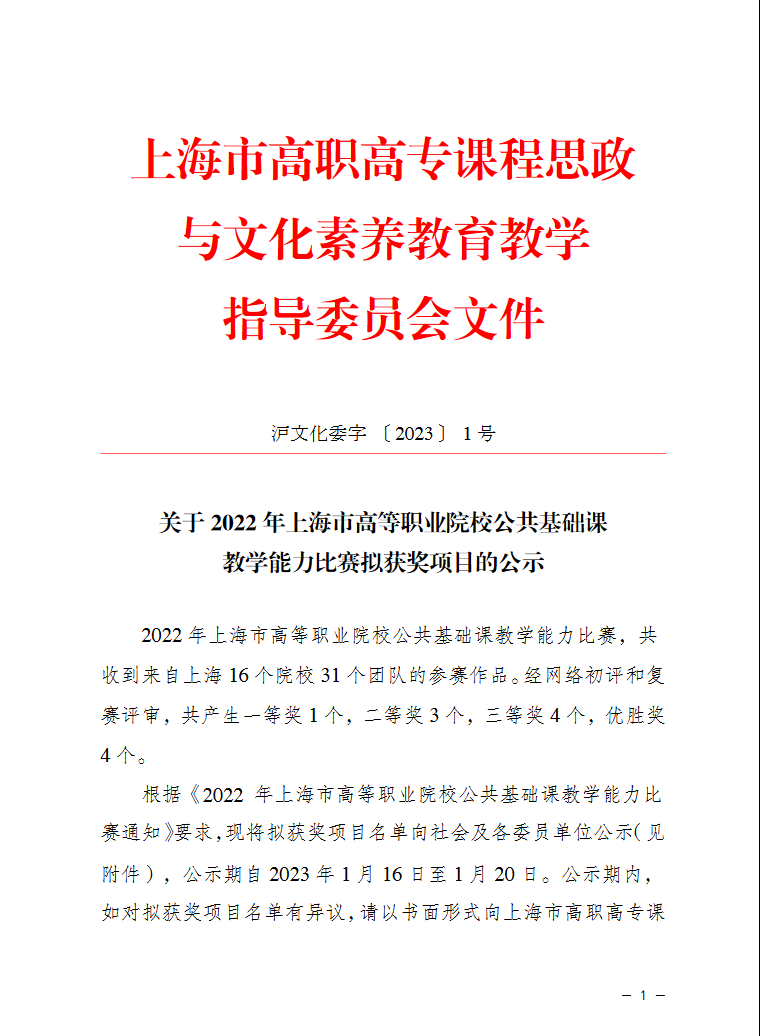 在上海市教育委员会职业教育处的指导下,由上海市高职高专课程思政与文化素养教育教学指导委员会主办的 2022 年上海市高等职业院校公共基础课教学能力比赛已圆满结束。比赛共收到来自上海 16 个院校 31 个团队的参赛作品。经网络初评和复赛评审,共产生一等奖1个,二等奖3 个,三等奖 4个,优胜奖4个。